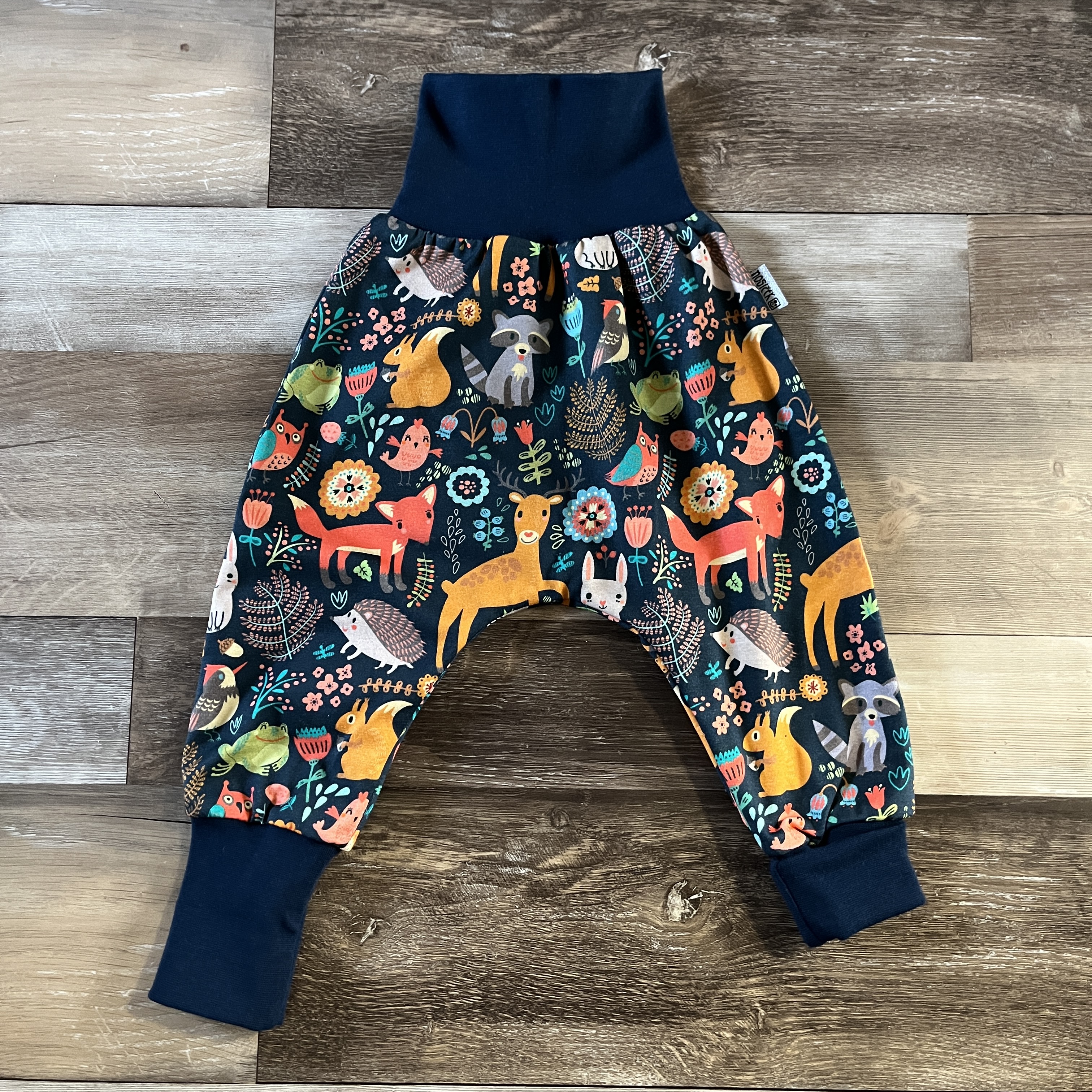 Klasické rostoucí baggy tepláčky (vhodné na klasické i na látkové pleny) z nepočesané teplákoviny. Náplety jsou extra vysoké jak v pase, tak na nožičkách, aby zajistily, že se tepláčky nebudou (nejen v nosítku a šátku) vyhrnovat ke kolínkům.