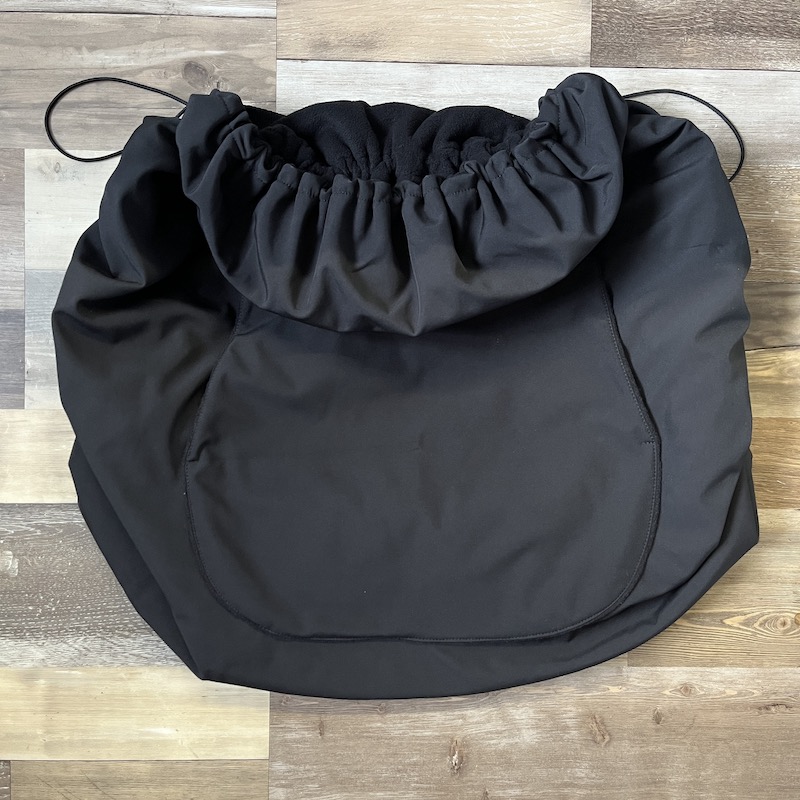 XXL kapsa je vyrobena ze zimního softshellu a flísu tak, aby bylo její použití co nejjednodušší a kapsa se dala snadno nasadit nejen na miminko v nosítku nebo šátku, ale i přezkami připnout na kočárek.